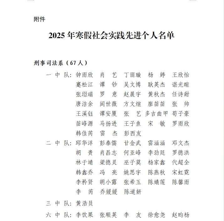 在2025年寒假期间,我院团员青年积极参与四川省大学生“三下乡·返家乡”社会实践活动,深入乡镇街道等基层一线,通过岗位实习实践、乡情民情考察、服务家乡建设等形式充分展现了警院学子“青春为中国式现代化挺膺担当”的使命感和责任感。为表彰先进,树立榜样,经四系团总支审核、院团委研究,决定授予钟雨欣等190名同学“社会实践先进个人”荣誉称号。